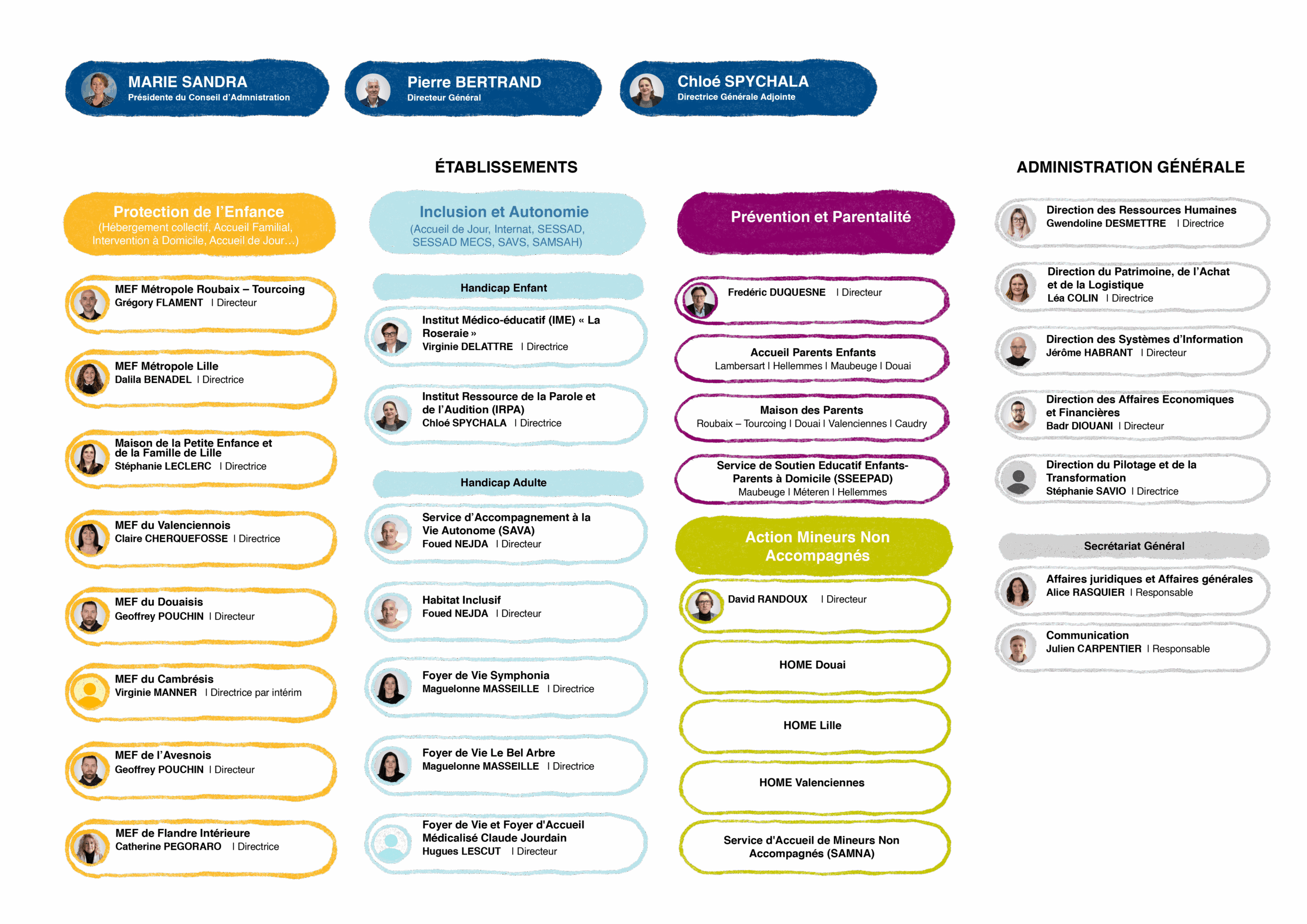 Le Conseil d’Administration (CA) de l’EPDSAE est composé de 13 membres désignés pour un mandat de 3 ans renouvelable. Il est présidé par Madame Marie SANDRA.